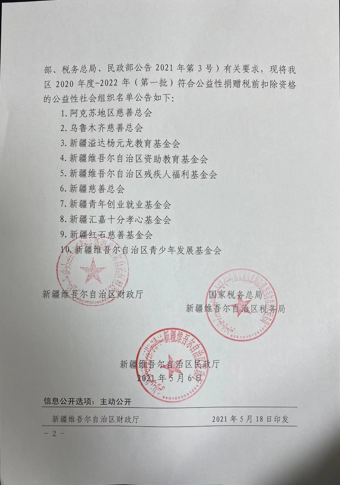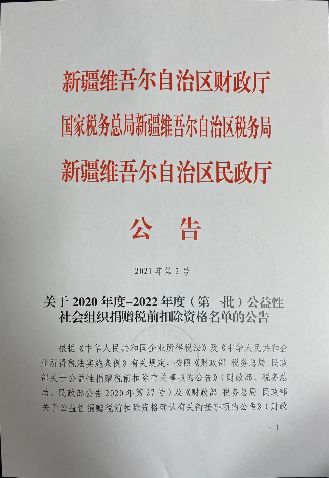 2021年5月,我基金会获得自治区财政厅、自治区税务局、自治区民政厅共同签发的税前扣除资格。